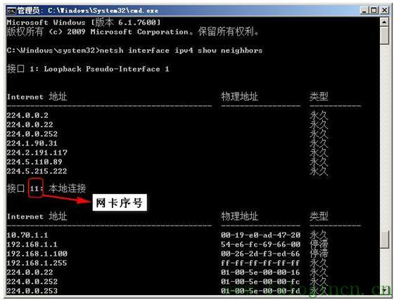 2、用 netsh interface ipv4 show neighbors 查看網(wǎng)卡序號。