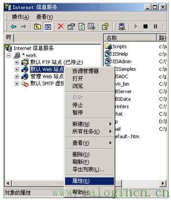 在“默認Web站點”上按鼠標右鍵,選擇“屬性”,彈出默認Web站點設置窗口: