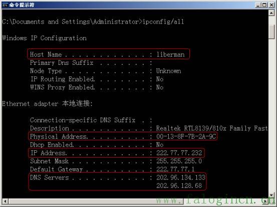 要發現和解決TCP/IP網絡問題時,通常首先檢查出現問題的計算機上的TCP/IP配置。使用ipconfig /all命令可獲得全面的主機配置信息,如下圖所示。既包括總體的IP配置信息,如主機名、IP地址、DNS、MAC地址等。
