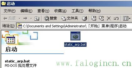保存就可以了,以后可以通過雙擊它來執行這條命令,還可以把它放置到系統的啟動目錄下來實現啟動時自己執行。打開電腦“開始”->“程序”,雙擊“啟動”打開啟動的文件夾目錄,把剛才建立的static_arp.bat復制到里面去: